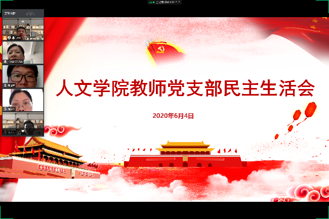 为认真贯彻习近平新时代中国特色社会主义思想和党的十九大精神,严格执行新形势下党内政治生活若干准则,增强党内政治生活的政治性、时代性、原则性、战斗性,6月4日下午,人文学院教师党支部通过腾讯会议组织召开了组织生活会和民主评议党员会议,教师党支部全体教师党员参加了会议,会议由支部书记江新华主持。