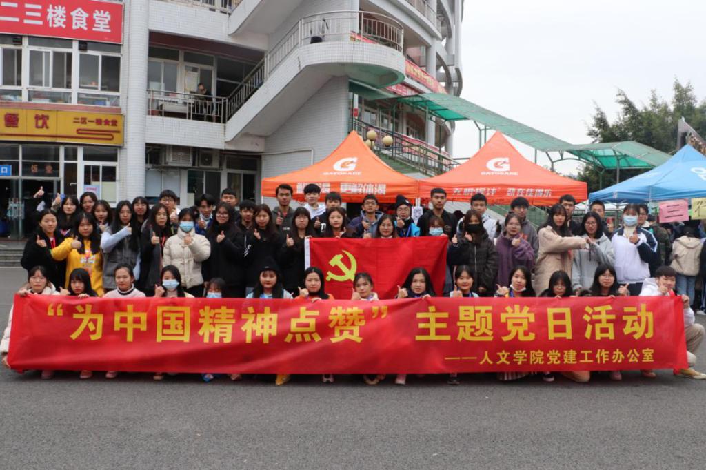 为深入贯彻学习党的十九大精神,弘扬中国精神,传承红色文化,12月17日上午,人文学院党建工作办公室在二区饭堂前开展以“为中国精神点赞”为主题的党日活动。