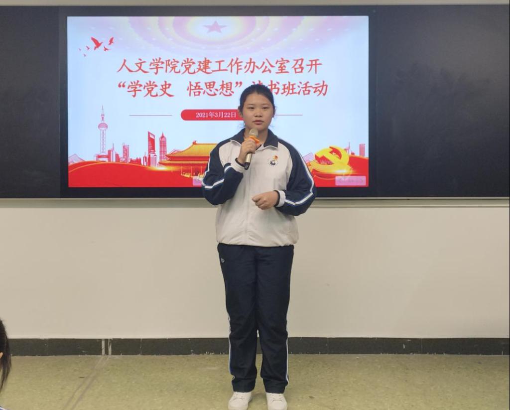 为积极贯彻习近平总书记在党史学习教育动员大会上的重要讲话精神,3月22日晚上8:30,人文学院党建工作办公室于人文艺术楼402教室召开“学党史,悟思想”读书班活动,活动由党建工作办公室指导老师李艳霞主持。