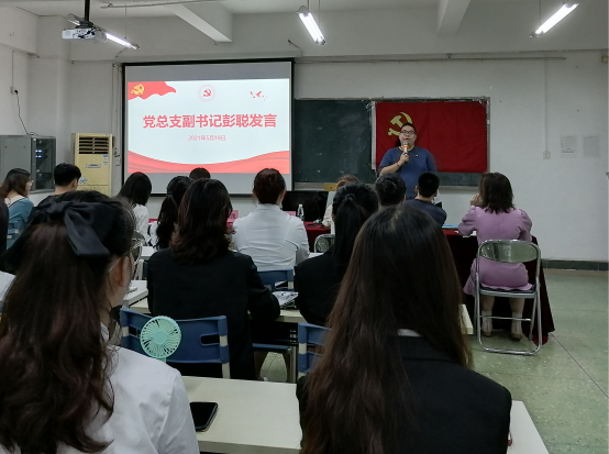 大会先由党总支副书记彭聪讲话,他指出,今年是建党100周年,他希望大家能秉承校训、党的宗旨,用实际行动为人民服务,为广大师生服务。同时他期望同学们能不忘初心、牢记使命,按学生党员标准要求自己,坚定信念、努力学习,甘于奉献、服务同学,争做先锋、发挥作用。在今后的日子里继续发光发热,铭记于此,不忘初心、牢记使命。最后他预祝本次大会圆满成功并与参会人员合影留念。