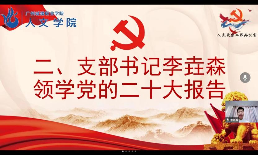 活动在庄严的国歌中拉开序幕。首先,李垚森书记带领支部成员学习党的二十大精神,向与会成员解读党的二十大报告“为什么说全党要把青年工作作为战略性工作来抓”理论专题,并落地讲解作为学生党员应该怎么在工作上、学习上、生活上体现自己作为党员的先进性。随后,支部成员依次进行对党的二十大报告内容的心得分享。紧接着,李垚森把一年来支部主要工作、取得的成绩、存在不足及下一阶段工作目标详细地进行报告。他强调,全体党员同志要充分结合党的二十大精神,准确把握党的二十大精神实质和丰富内涵,切实增强坚定拥护“两个确立”、坚决做到“两个维护”的政治自觉,把理论转为实践,结合党员身份努力学习,立足岗位,服务师生。