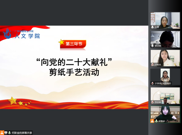 活动在全体师生奏唱庄严的国歌中拉开帷幕。首先,由党支部书记黎诗敏进行党的二十大报告解读,她指出,学习党的二十大精神是我们青年明确方向,坚定信念的必由之路。全体党员同志在面对各种风险挑战时要坚持党的全面领导,要明白国家推进的现代化是怎样的现代化,发展是怎样的发展。接着,由何斯金同志带领我们进行“向党的二十大献礼”剪纸手艺活动。在剪纸艺术中进一步增强党员意识,将党刻入心中。随后,播放各位学生党员拍摄“学悟党的二十大,我想对党说”的视频,在视频中党员们纷纷表示会从身边做起,提高自身综合素质以更好地服务人民。最后,由黎诗敏书记进行会议的总结并提出寄望,黎诗敏书记谈到,虽然我们因疫情居家隔离上网课,但也要继续系统学习党的二十大精神,全面把握党的二十大精神,做到知其然,知其所以然。