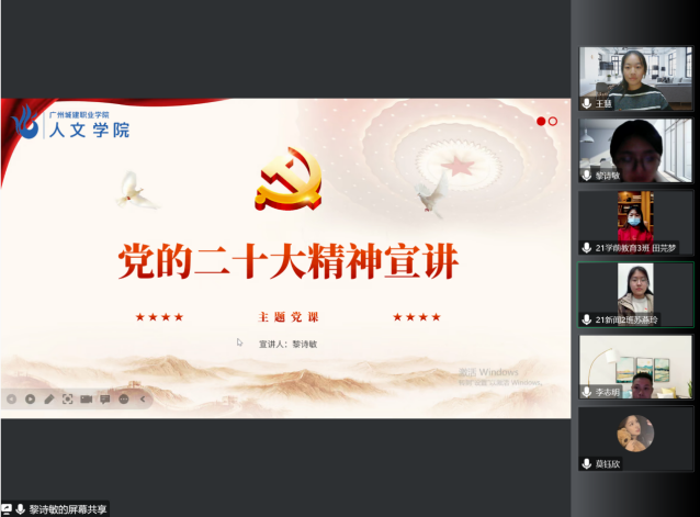 为推动学习宣传贯彻党的二十大精神走深走细走实,引领学生党员的思想与行动与党的二十大精神相统一,人文学院学生第三党支部于12月18日16:00在腾讯会议召开贯彻党的二十大精神专题学习会,人学学院学生第三党支部书记黎诗敏和全体党员参加会议。