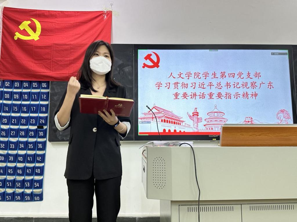 为深入学习贯彻习近平新时代中国特色社会主义思想主题教育工作会议上的重要讲话精神,进一步增强对党的价值追求和前进方向的高度政治认同,人文学院第四党支部于5月11日在人文艺术楼121阶梯教室开展学习贯彻习近平新时代中国特色社会主义思想主题教育读书班和学习贯彻习近平总书记视察广东重要讲话重要指示精神专题学习。人文学院党委组织员李艳霞,第四党支部组织委员董蕙、宣传委员郑妙英和第四党支部全体成员出席,会议由党支部书记吴伟仪主持。