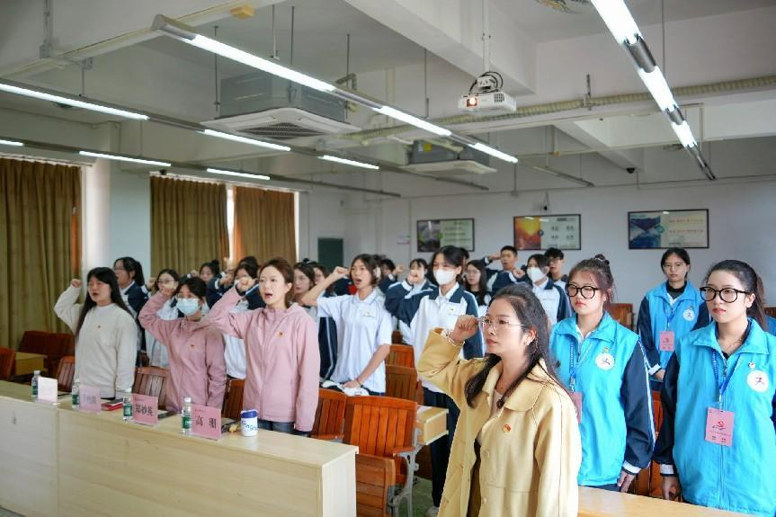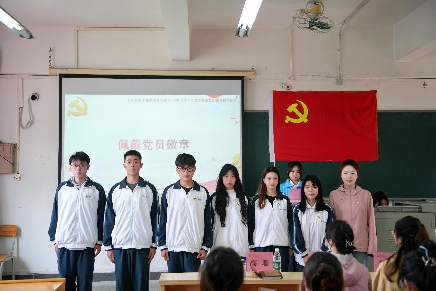 为加强党的队伍建设,为党输送更多的新鲜血液,经人文学院学生第四党支部教育、培养、考察、发展及答辩通表等环节,报上级党委审批,同意吸收李浩锋等23位同志为中共预备党员。11月15日上午10:30,人文学院学生第四党支部在人文艺术楼626课室举行2023年下半年预备党员宣誓暨佩戴党员徽章仪式。学院党委组织员李艳霞,第四党支部组织委员董蕙,宣传委员郑妙英和教师党员高珊出席本次会议。