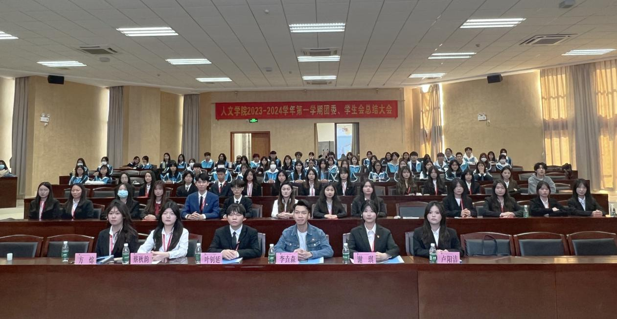 会议在激昂的团歌声中拉开序幕,首先学院第三届第三任团委学生副书记谢琪、叶钊延,第八届学生会执行主席蔡秋韵,融媒体中心主任卢阳洁,文体发展中心主任方熔分别就分管的部门和队伍的工作情况进行总结汇报。随后进行颁奖仪式,现场颁发了第二十一届文体艺术季先进个人、第七届“青马工程”之第七届“初心”培训的优秀学员和支队、本学期团学工作优秀干部和干事的奖项。最后李垚森书记作总结讲话,他感谢全体人文团学的成员在本学期的辛勤付出,尤其是在本学期学生活动任务重的情况下,体现出团学组织“有事做,能做事,做成事”的品质,也取得了一些成绩,斩获2023年军训先进集体、校园文体艺术季优秀组织奖、校运会优秀组织奖等荣誉,同时指出本学期一些工作的问题,在反思中成长。