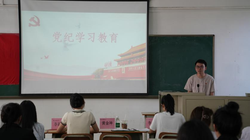 在深入推进全面从严治新时代党的背景下,为持续强化党员纪律意识,筑牢思想防线,我院学生第三党支部于5月11日下午在人文艺术楼503开展党课学习暨党纪学习教育党日活动。学院学生第三党支部书记黄金坤、宣传委员李毅珊、组织委员李苏玲出席本次大会。