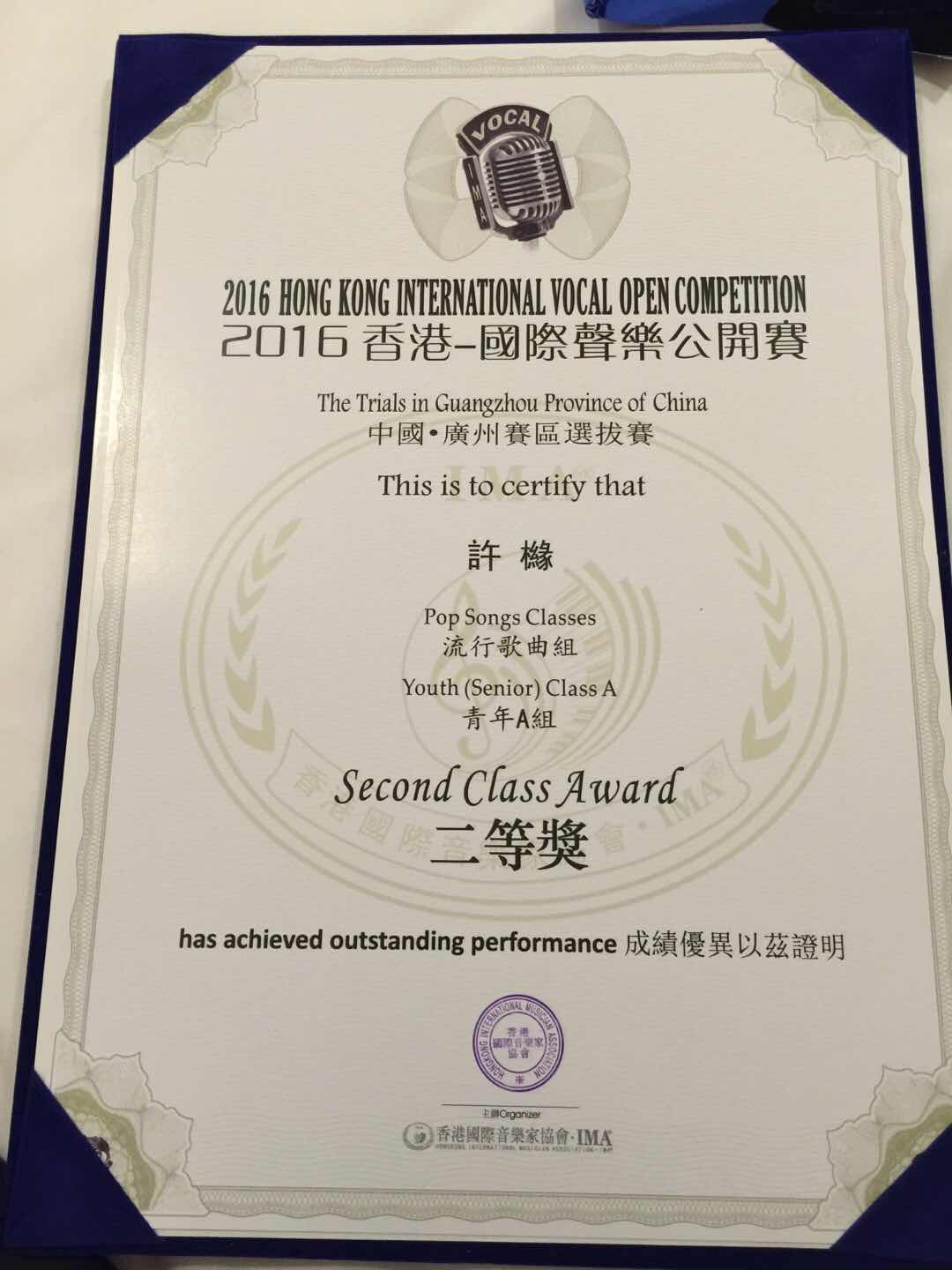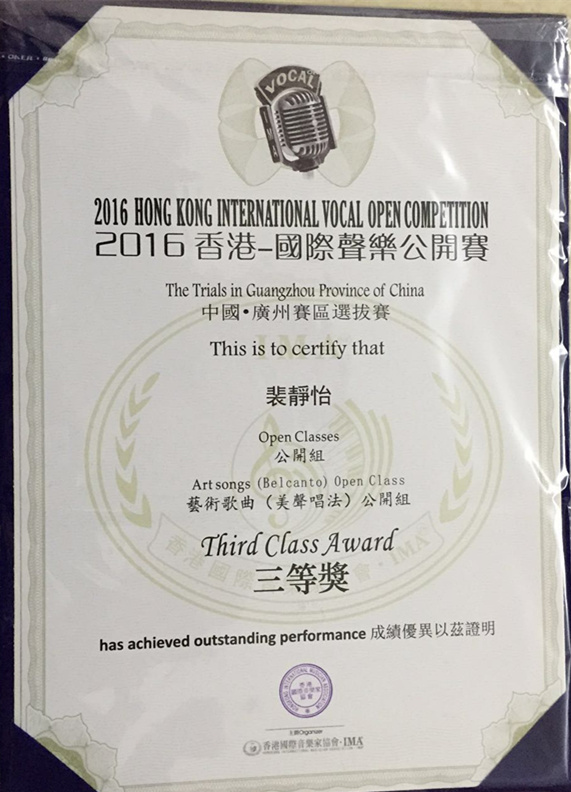 近日,从“2016香港-国际声乐公开赛”组委会获悉,我校人文学院2014级音乐表演专业学生许橼、裴静怡在“2016香港-国际声乐公开赛”香港总决赛中分别获得流行歌曲组三等奖和公开组优秀奖,为学校赢得了荣誉。