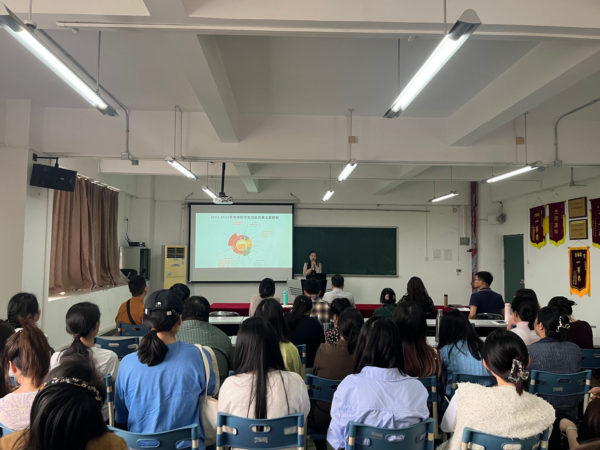 王婧对2023-2024学年学生技能竞赛进行简单总结,通过数据分析、获奖比例、经费投入、获奖数量排名等方面进行剖析,对各教研室、竞赛指导老师的辛勤付出进行肯定。