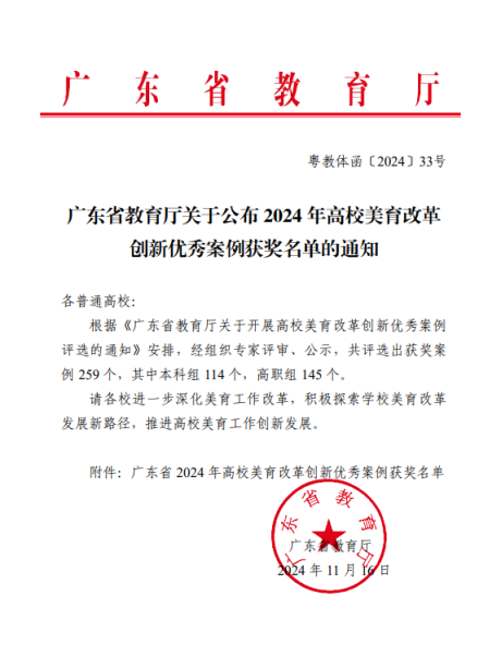 近日,由广东省教育厅举办的广东高校美育改革创新优秀案例评选获奖名单揭晓,全省本、专科学校共有259个案例上榜,我院余蓉、朱丽芳教师团队获高职组二等奖,王文春、李科锋、王婧教师团队获三等奖,这是我院教师参加全省高校美育改革创新优秀案例评选的一个突破。