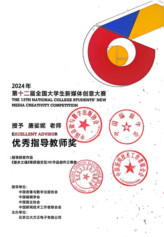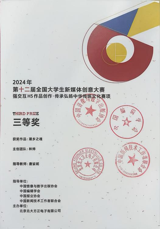 近日,由中国音像与数字出版协会、中国编辑学会、中国新闻技术工作者联合会、中国报业协会等单位指导,北京北大方正电子有限公司主办的第12届全国大学生新媒体创意大赛获奖名单正式公布。我院网络新闻与传播专业林烨同学制作的H5作品《潮乡之魂》荣获全国三等奖,指导老师唐娑妮获“优秀指导教师奖”,这是我院学子参加本赛项取得的最好成绩。