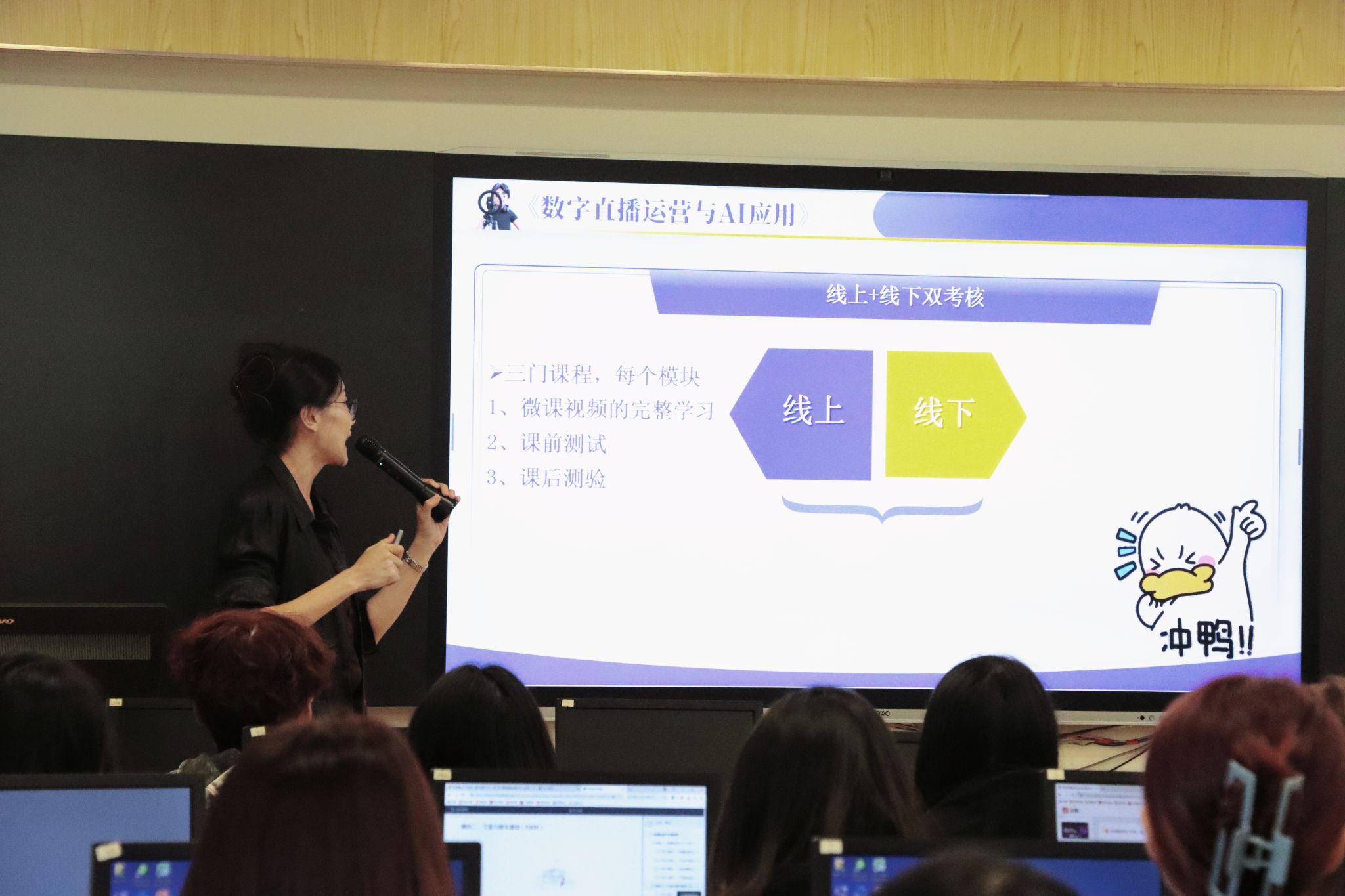 据悉,微专业以“直播电商全流程运营”与“AI工具创新应用”为核心内容,涵盖直播选品、文案、短视频创作、直播策划、数据分析、智能内容生成等前沿内容。课程采用“线上+线下”融合教学模式,其中线上课程依托学院数字化学习平台,提供线上微课、案例库、在线答疑、课后练习等资源,方便学生利用碎片化时间巩固知识;线下课程则以实训教室为阵地,通过模拟直播间搭建、设备操作演练、小组协作完成直播任务等形式,让学生沉浸式体验直播全流程。这种“实践与理论并行”的教学方式,有效打破了传统课堂填鸭式教学的局限,帮助学生快速适应行业实操需求。