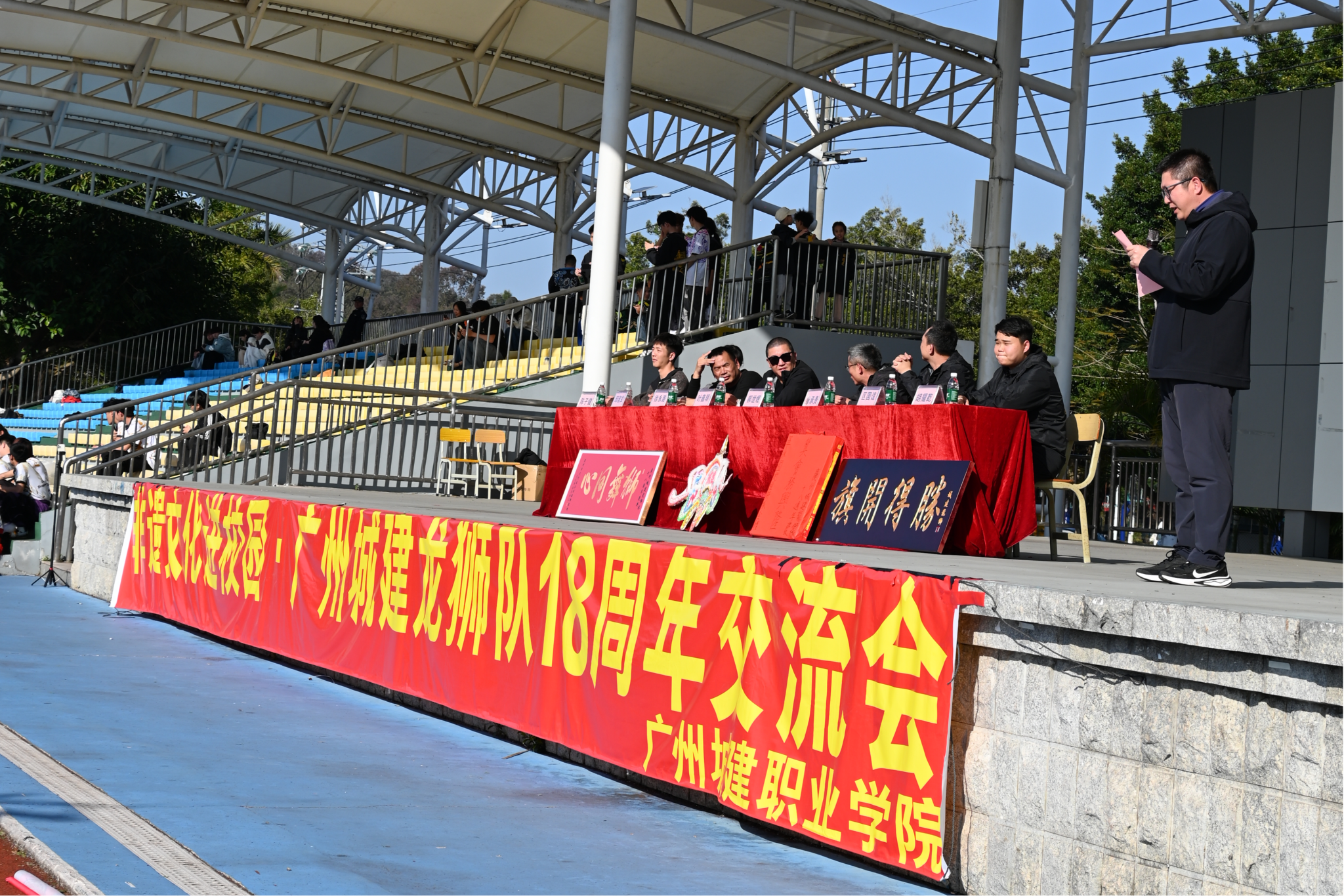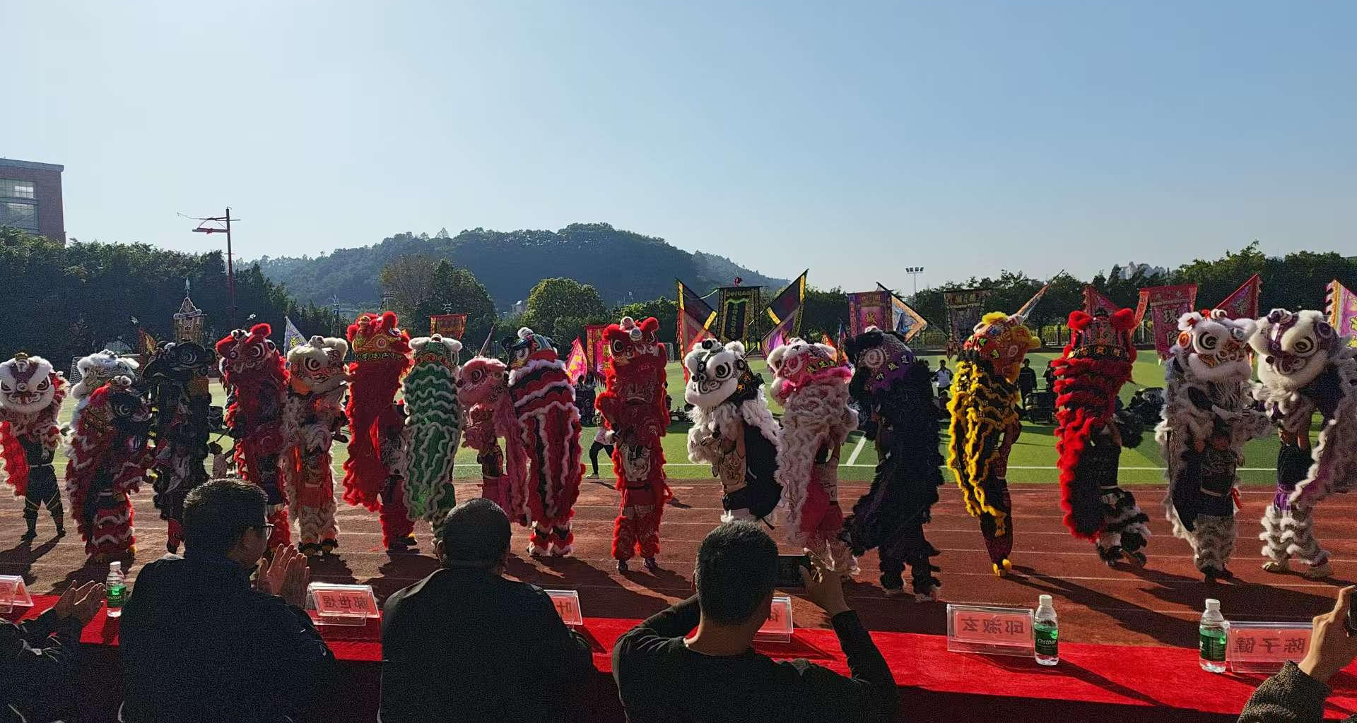 为弘扬中华优秀传统文化,促进高校间文体艺术交流,展现当代大学生蓬勃向上的精神风貌,由太阳网集团tcy8722主办的“广州城建龙狮队18周年交流会”于1月11日下午在从化校区田径场隆重举行。来自省内的20所高校和单位龙狮代表队300多位龙狮人齐聚一堂,以狮会友,共同奉献了一场力与美交织、传统与现代融合的文化盛宴。参加交流会领导嘉宾有来自中山市龙狮运动协会副会长兼裁判委员会主任,中山市三角龙狮协会长,国际级龙狮裁判员叶嘉明,从化区龙狮武术协会长陈子健,广州市花都区大塘边国际少青、花都龙狮运动协会副主席,国家一级龙狮裁判员教练员徐永路,肇庆市威义蔡李佛拳馆国家一级龙狮裁判员裁判员区国谊、廖承贵,高要武术协会副会长国家一级武术教练员、龙狮教练员胡耀乾以及我院副院长郝世煜、广州城建龙狮队指导教师邱淑玄等。