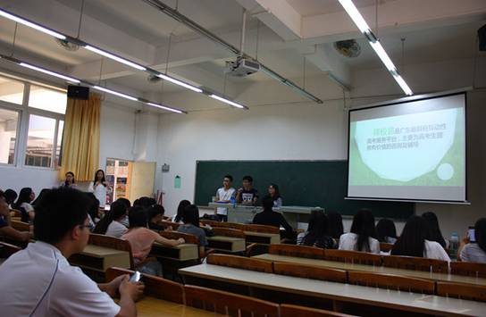 会上,特邀广州豆蔻信息科技有限公司的马凯雄、林怡宏、庄桂芳等五位大二的学生职员为大家讲解公司业务和工作情况。马凯雄同学用生动的PPT课件为师弟师妹们展示了豆蔻公司的四大信息平台,包括工作城、择校易、兼职邦、聚学堂等。庄桂芳、林怡宏等两位同学则分享了他们在豆蔻公司的工作经历和成长感悟。五位大二的学生职员还结合实战,分享了他们对网络推广的理解。在随后的问答环节中,学生们积极提问,向师兄师姐们了解豆蔻公司运作的具体事宜以及工作、学习如何平衡等,对专业学习方向有了更加清晰地认识和理解。