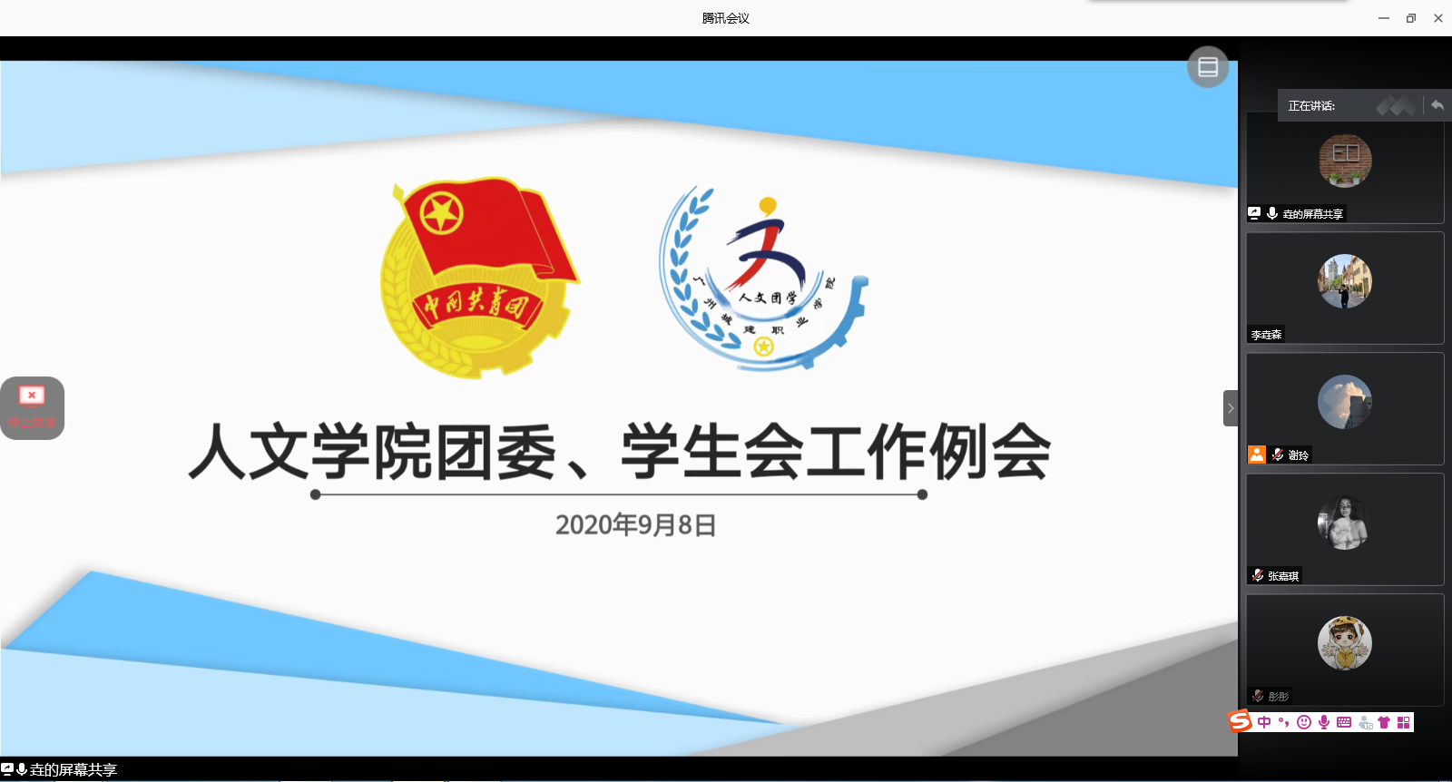 为进一步明确学院团委、学生会各部门工作职责,加强团委制度建设,发挥学生会联系同学的桥梁和纽带作用,9月8日下午3:00,人文学院团委、学生会利用腾讯会议开展线上例会。学院团委书记李垚森主持,学院团委、学生会全体干部参会。