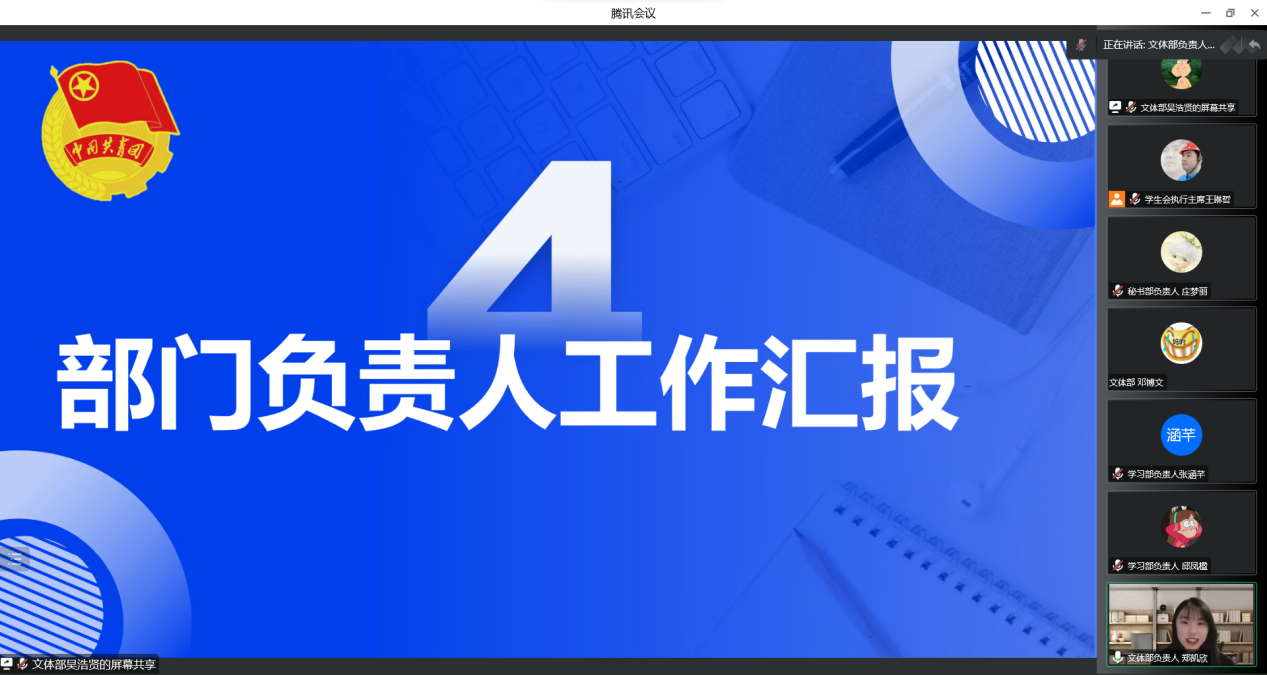 会议在庄严的团歌中拉开序幕。首先,李垚森领学党的二十大报告内容和精神,指出学生会成员要认真学习党的二十大报告内容,在工作开展中以问题为导向,不断创新活动载体,完善服务育人机制,加强政治理论学习,以提升政治高度、工作力度、服务温度、办事速度为重要抓手,以抓好学风建设为突破口,着力推进学生会改革创新,齐心协力,团结协作,不断增强学生会组织的凝聚力和战斗力。随后,学生会各工作部门成员依次根据主责主业,分别从思想引领、校园文化、权益维护、社会实践等方面进行述职。最后,学生会执行主席王琳哲作总结,她说到,人文学院第七届学生会本年度在工作中积极进取,在学院党委,校学生会以及院团委的正确领导下积极开展工作,获得了一定成绩也存在一些不足,希望全体成员在接下来的工作中踔厉奋进,再创佳绩。
