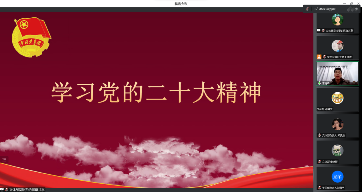 为深入学习宣传贯彻党的二十大精神,落实学生会组织述职评议制度,进一步增强学生干部的责任意识、服务意识、大局意识和奉献意识,推动学习教育理念深入师生、深入基层、深入人心,12月16日晚上8:30,人文学院通过线上腾讯会议开展第七届学生会学生干部述职评议会暨党的二十大专题学习会,人文学院团委书记李垚森、学院第七届学生会全体工作人员和学生代表参加本次评议会。