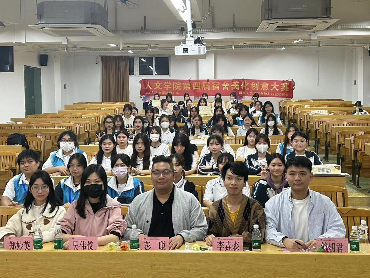 为加强新时期党建和思想政治工作在“一站式”学生社区中实践,提升学生社区育人实效,使学生更好健康成长,由人文学院学工办主办,团委自律与权益委员会承办主题为“‘宿’说青春,‘寓’见美好”的第四届宿舍创意美化大赛决赛12月14日19:30分在人文艺术楼305阶梯教室举行。人文学院党委副书记、副院长彭聪,团委书记李垚森,社区指导老师赖明君,辅导员代表,参赛宿舍和学生代表出席本次活动。