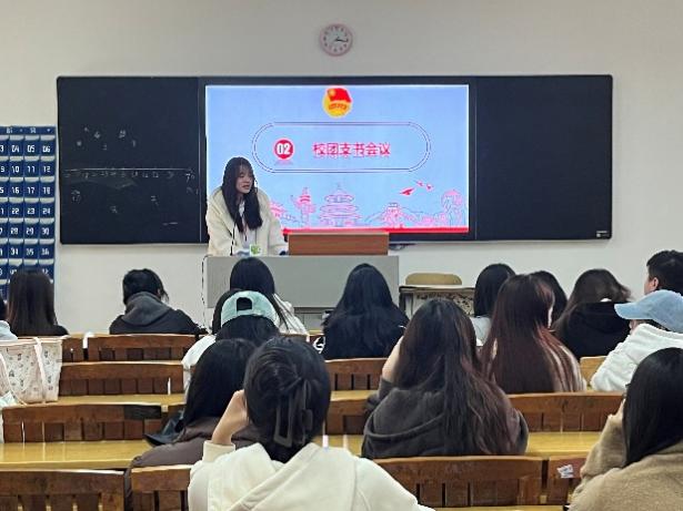 首先,全体与会成员共同奏唱团歌。随后李垚森带领全体与会成员进行第一议题学习,并且明确团支书近期的重点工作。然后,学生干部陈舒蔓对学校共青团系统评优的相关文件进行解读,最后,丘梓玥对本学期团日活动的相关文件进行解读,详细地介绍了工作的流程和附件提交的注意事项。