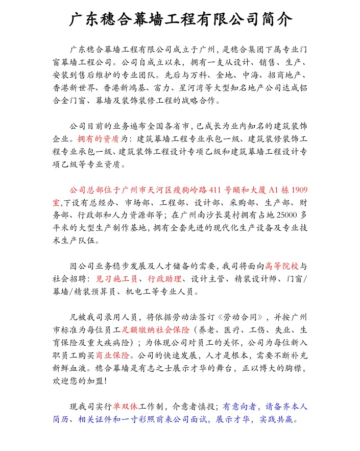 广东穗合幕墙工程有限公司招人了