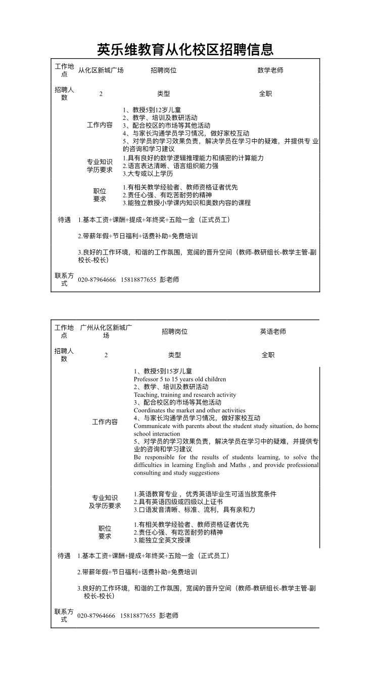 英乐维教育从化校区招聘