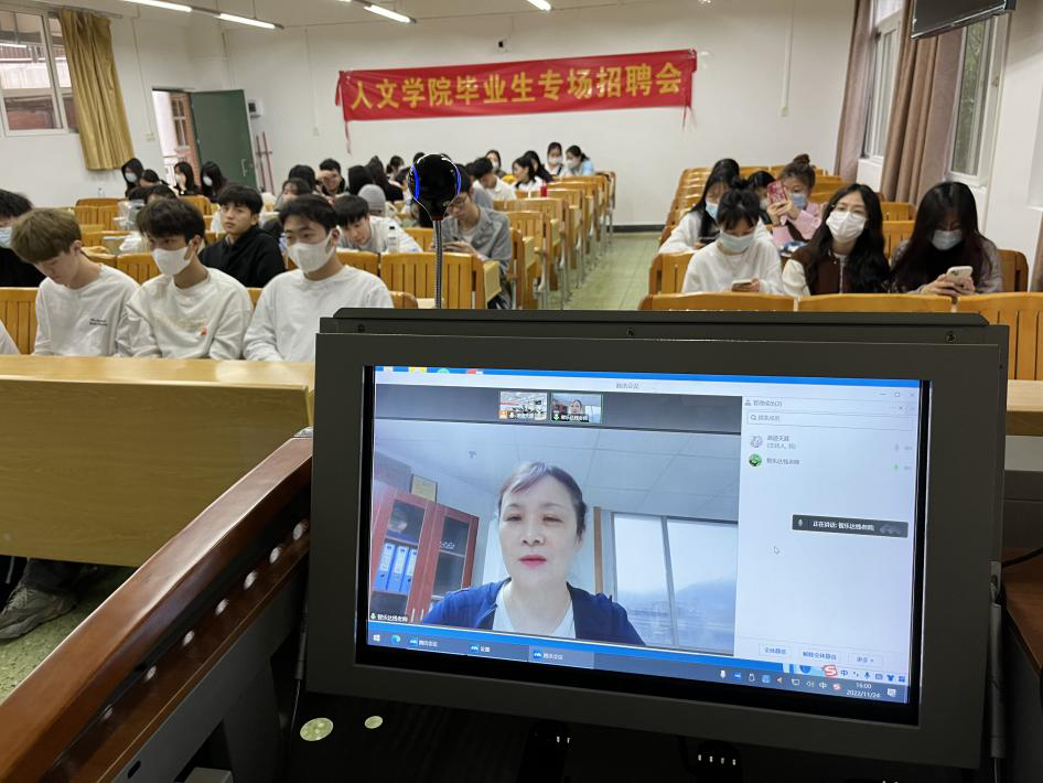 人文学院学工办于11月24日14:30在人文艺术楼424课室召开2023届毕业生第七场招聘宣讲会。为做好疫情防控要求,本次招聘会采用线上宣讲+线下参与的方式进行,智乐达教育投资服务(深圳)有限公司总经理吴彩金女士、招生合作板块负责人钱康、人文学院副院长彭聪、毕业班辅导员刘俊及2023届毕业生参加宣讲会。