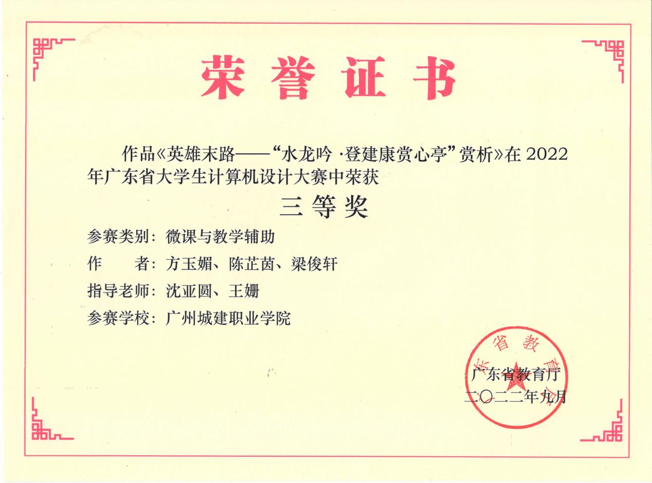 近日,由广东省教育厅主办,广东外语外贸大学承办的2022年度广东省大学生计算机设计大赛结果公布,我院网络新闻与传播专业群推荐作品《英雄末路——<水龙吟·登建康赏心亭>》赏析荣获三等奖。获奖团队成员分别是来自网络新闻与传播专业的方玉媚,传播与策划专业的陈芷茵、梁俊轩,其获奖作品为中国古诗词文化的输出提供了新思维、新方式。