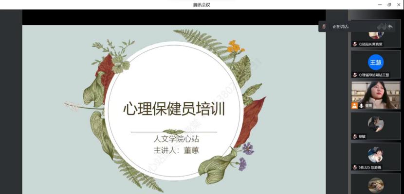 为了进一步落实心理健康教育工作,营造良好的宿舍环境,帮助心理保健员更好地认识工作职责,同时遵守疫情防控要求,人文学院于12月7日晚上8:00在腾讯会议室召开2022-2023学年第一学期心理保健员培训。本次培训由人文学院心理辅导站指导老师董蕙主讲,人文学院全体心理保健员及心理辅导站干部参与培训。