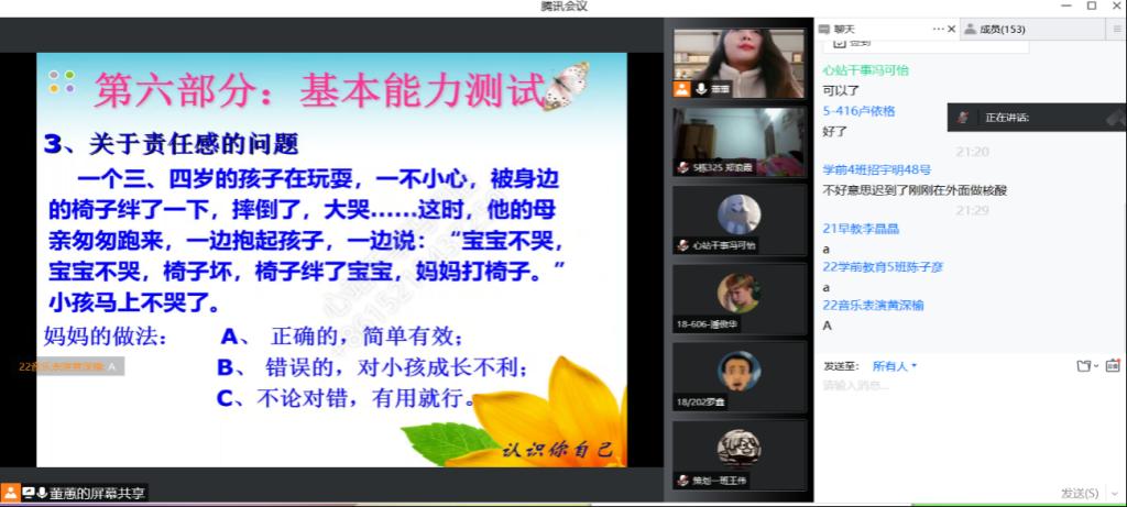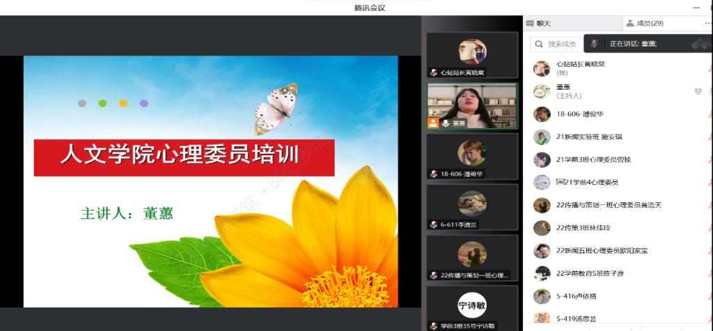 为进一步加强学生管理工作,落实心理健康教育工作,帮助心理委员更好地认识工作职能,同时配合疫情防控要求,人文学院学工办于12月7日晚上9:00在腾讯会议室开展2022-2023学年第一学期心理委员培训。本次培训由人文学院心理辅导站指导老师董蕙主讲,人文学院全体心理委员及心理辅导站干部参与培训。