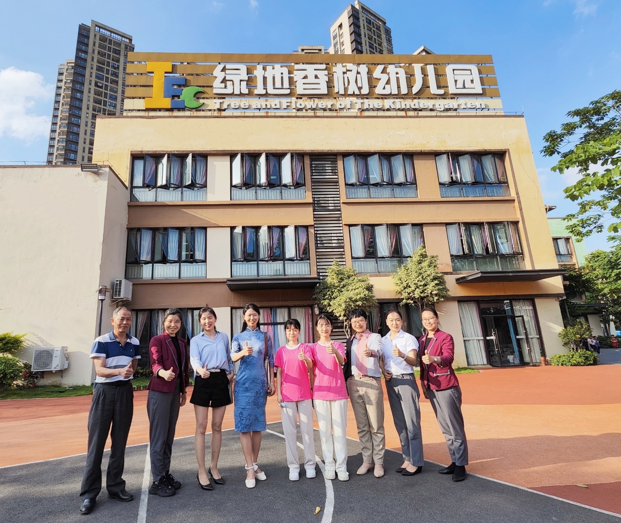 校企双方在绿地香树幼儿园与实习生合影