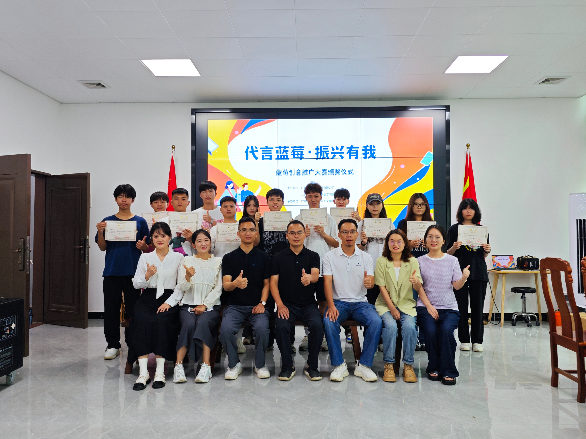 6月1日,“代言蓝莓·振兴有我”蓝莓创意推广大赛颁奖仪式在从化区“蓝朋友”蓝莓农场隆重举行,广州智臻农业科技有限公司总经理李世勇,学校团委书记甄伟文,我院新媒体专业群教研部部长沈亚圆及新媒体专业群教师代表出席了颁奖仪式。
