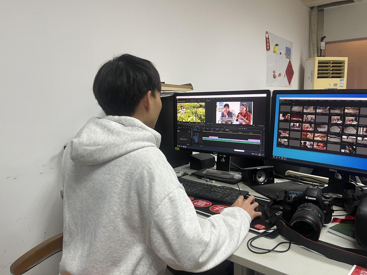 在从化融媒体中心新闻部,王梓欣深度参与了《绿美从化,职工力量》《从化荔枝花开满园,丰收在望》等专题报道的采编工作。从采访提纲设计到现场沟通,从新闻稿件撰写到电视新闻剪辑,她将课堂所学的文案策划与活动统筹能力灵活运用于实践。在电视新闻后期制作中,她通过合适的节奏把控和字幕设计,使报道更具感染力。“新闻不仅是信息的传递,更是社会责任的承载。”王梓欣表示,此次实践让她深刻体会到新闻工作者的使命担当。